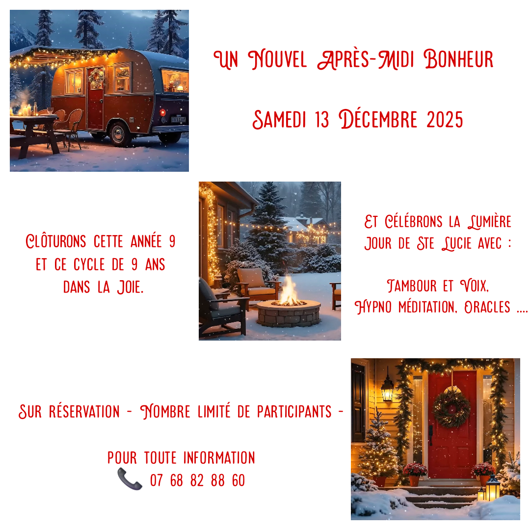 Ce cycle de 9 ans d’apprentissages intenses, nous le clôturerons avec gratitude et douceur envers nous-mêmes (m’aime). Et nous nous préparerons à en ouvrir un nouveau avec bienveillance et reconnaissance, en laissant entrer à la veille de 2026, la Lumière ( jour de Ste Lucie) dans nos parts d’ombre.